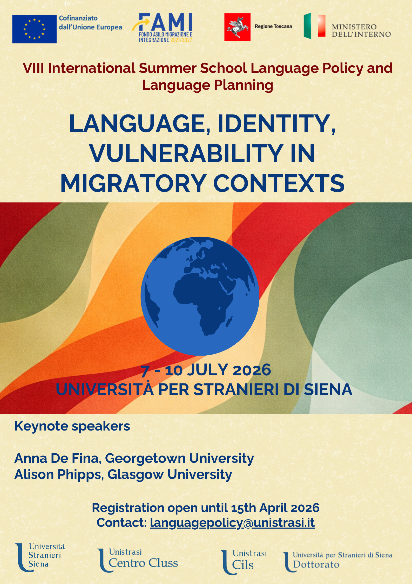 collaboration with the CILS Centre (FAMI PROFT project) and the PhD Program in Historical Linguistics, Educational Linguistics and Italian Studies (Curriculum 1), will organize the 8th International Summer School on “Language Policies and Language Planning – Language, Identity, Vulnerability in Migration Contexts” from July 7 to 10, 2026. The topics of the Summer School will include:
