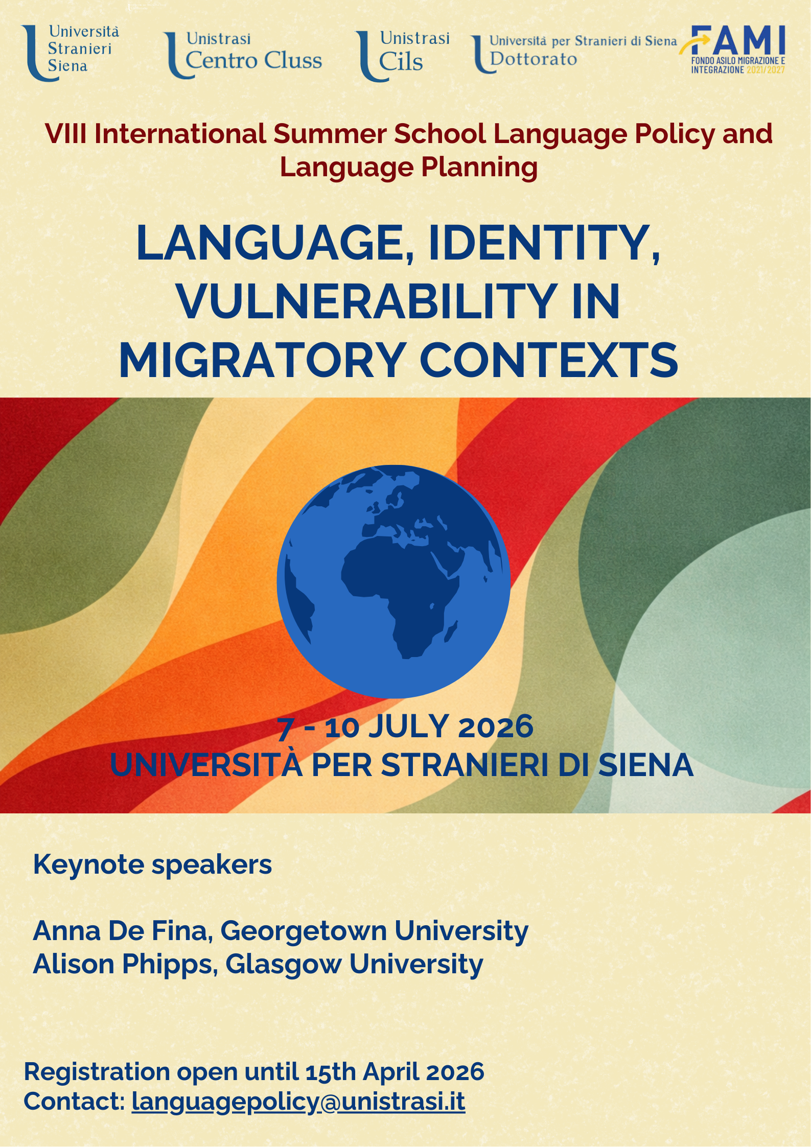 collaboration with the CILS Centre (FAMI PROFT project) and the PhD Program in Historical Linguistics, Educational Linguistics and Italian Studies (Curriculum 1), will organize the 8th International Summer School on “Language Policies and Language Planning – Language, Identity, Vulnerability in Migration Contexts” from July 7 to 10, 2026. The topics of the Summer School will include: